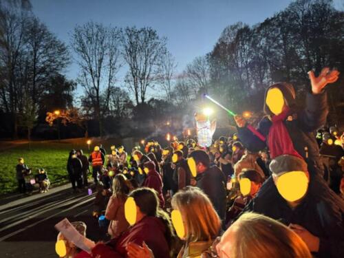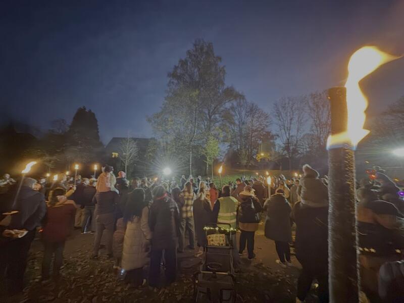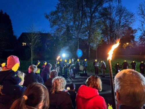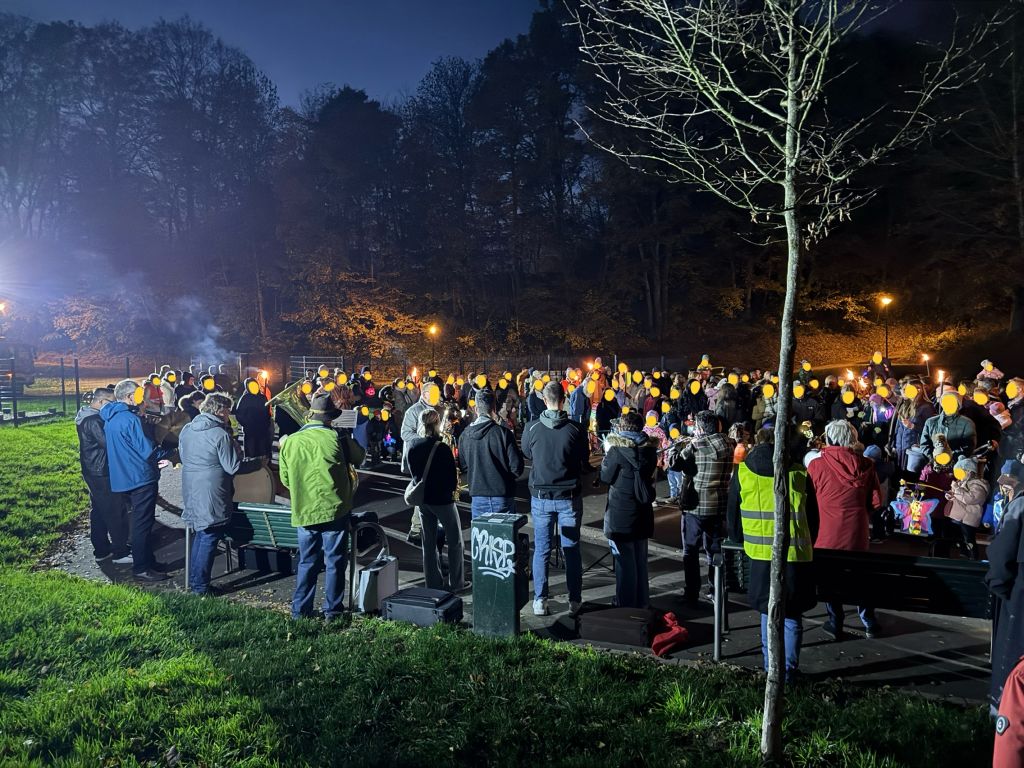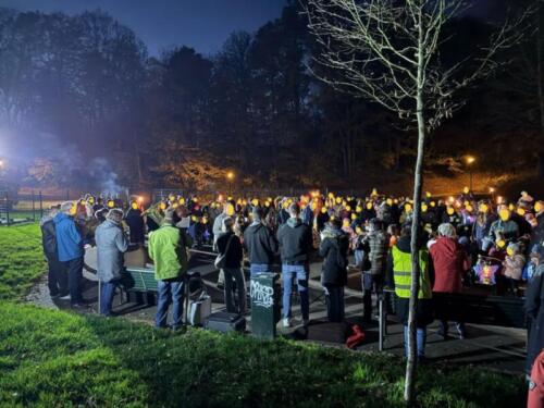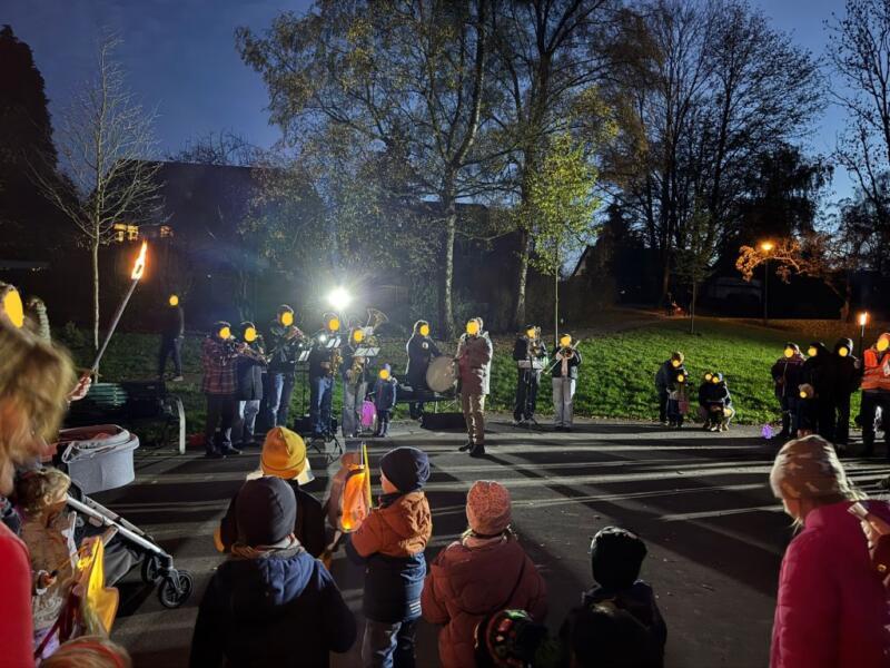 Zum ersten Mal veranstaltete der Initiativkreis Hilgen-lebt e. V. am Donnerstag, den 06. November in Hilgen einen Sankt Martins-Liederabend auf dem Spielplatz Müllersbaum für Hilgener Kitas. Um 17:30 Uhr versammelten sich Mitarbeiter*innen, Eltern und Kinder der Kindertagesstätte Sonnenblume, der Kleinen Strolche und der Johanniter Rosenkranz sowie das Blasorchester Neuenhaus. Frau Küppers begrüßte als Verantwortliche des Vereins alle Anwesenden und thematisierte die Sankt Martins-Geschichte kindgerecht. Während sich Groß und Klein im Kreis aufstellte, leuchteten die vielen Laternen der Kinder sowie Fackeln um die Wette und sorgten für entsprechende Stimmung. Auch die Feuerwehr war anwesend, um eine ausreichende Beleuchtung sicherzustellen. Eine halbe Stunde lang wurden gemeinsam Sankt Martins-Lieder gesungen, während die Sängerinnen und Sänger von der schönen Musik des Blasorchester begleitet wurden. Es war die erste Veranstaltung dieser Art, die vom Initiativ-Kreis Hilgen-lebt organisiert wurde. Im Januar soll ein Reflexions-Treffen stattfinden, um den Abend nochmals zu besprechen und ggf. Änderungen oder Verbesserungen für das kommende Jahr festzulegen.