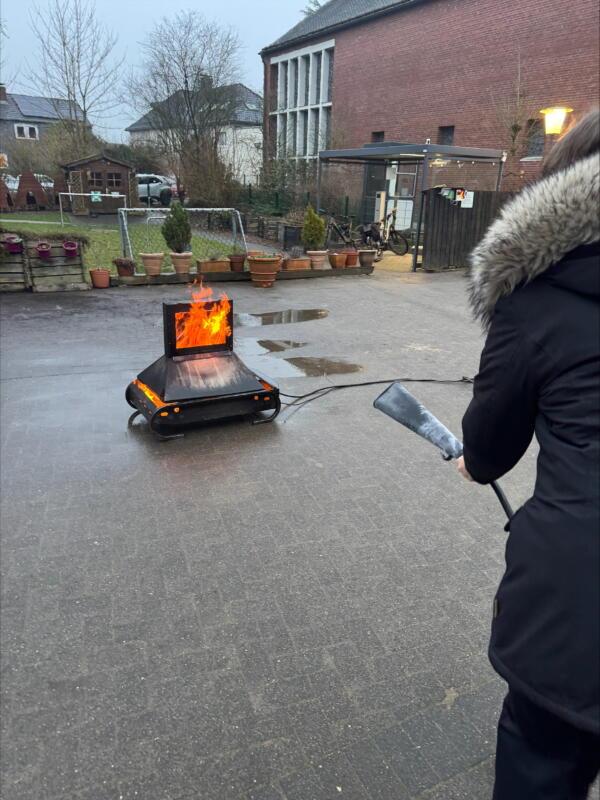 Nach dem theoretischen Teil ging es für das gesamte Team auf unser Außengelände. Dort durfte jede*r Mitarbeitende mit einem echten Feuerlöscher üben und ein kontrolliert entzündetes Feuer eigenständig löschen. Diese praktische Übung ist ein zentraler Bestandteil der offiziellen Richtlinien und vermittelt wertvolle Sicherheit und Routine.